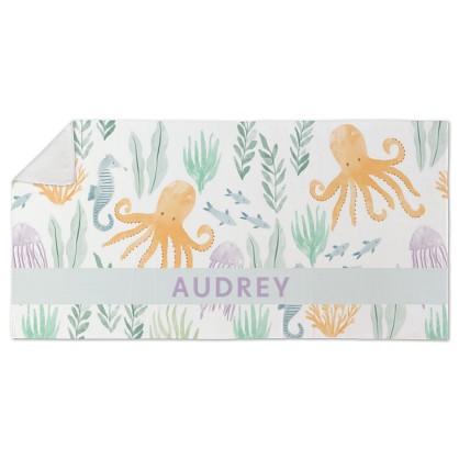 Take a dive into the deep blue with this personalized beach towel. Featuring a colorful sea adventure with octopus and seahorses, it’s the perfect accessory for any ocean lover.