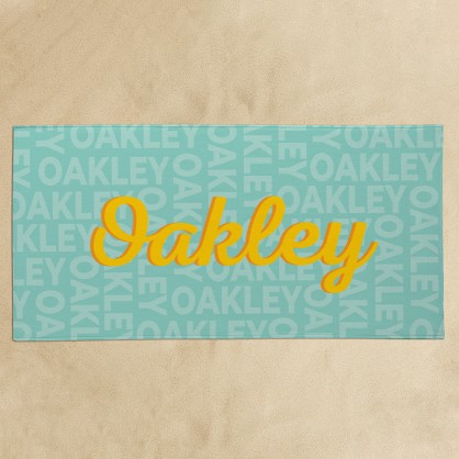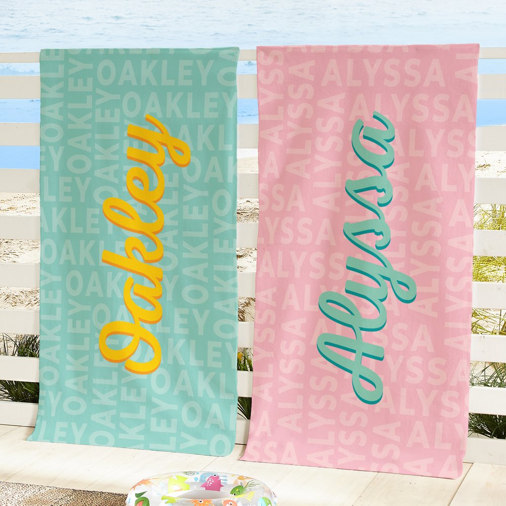 This custom beach towel is sure to make waves! Featuring vibrant, retro-style lettering, add any name for a totally personalized summer essential.
