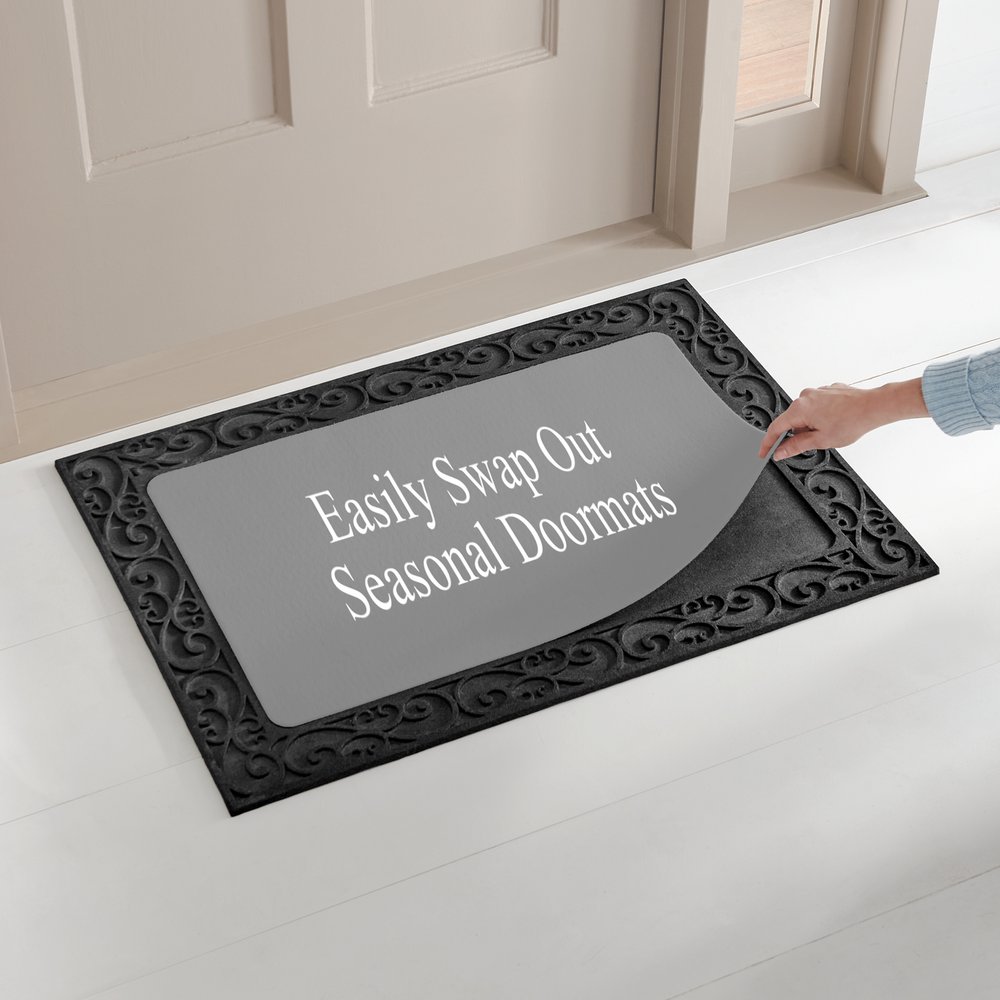 - Decorative scrollwork holder measures 23.5"x33.5" or 30.5"x42.5" and is made of 100% recycled rubber with holes on the bottom for draining