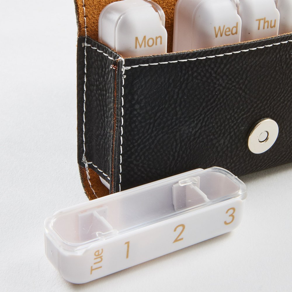- Leatherette case with magnetic snap closure holds 7 removable pill cases