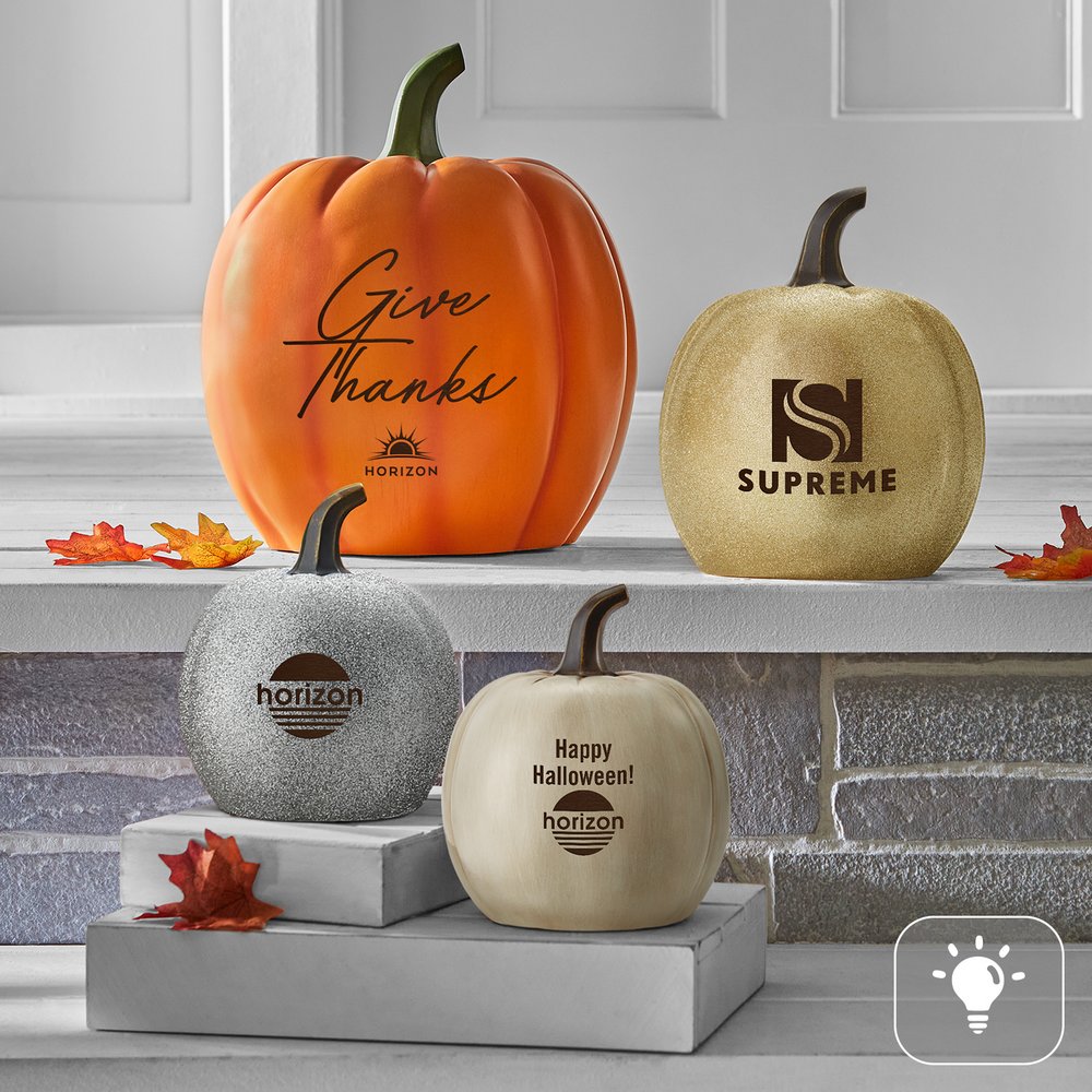 Make a statement this season with a custom light-up pumpkin featuring your company name and logo. Perfect for offices, events, or seasonal décor, it adds a festive glow while showcasing your brand in style.
