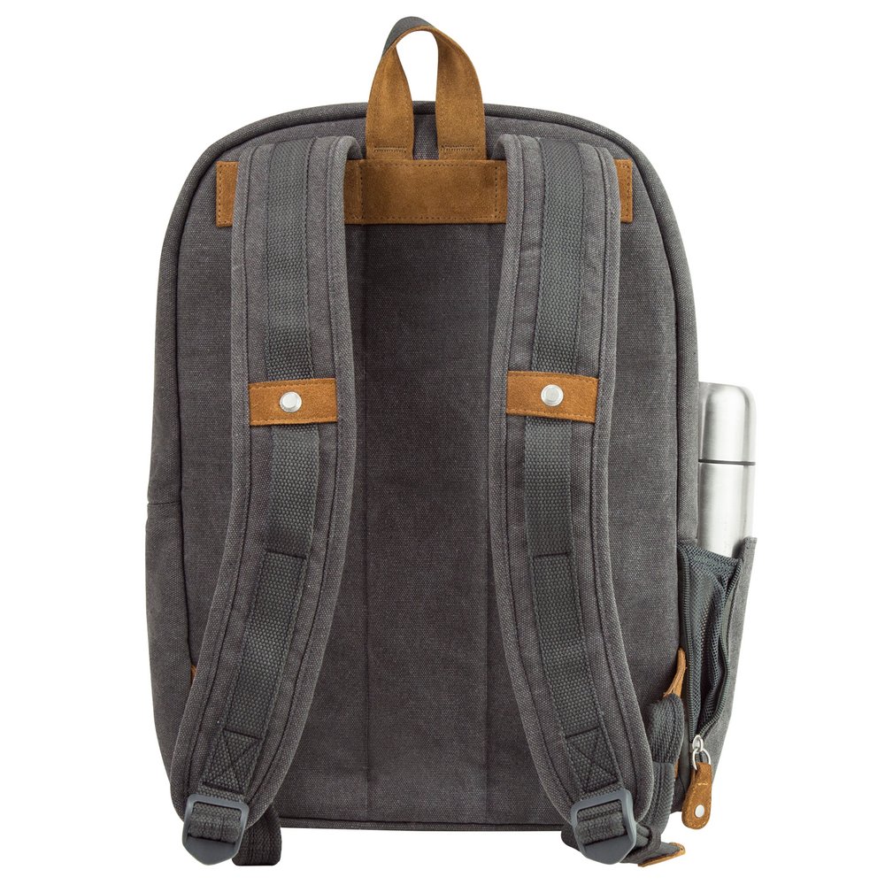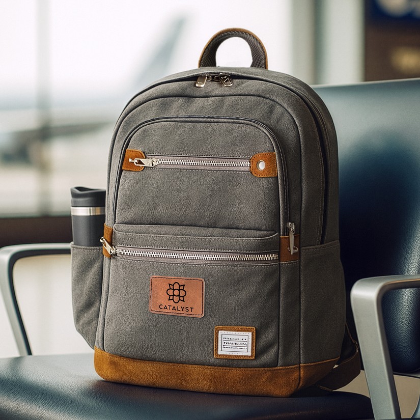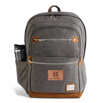 Combine security, style and personalization with this premium canvas and suede travel backpack with anti-theft compartments. Perfect for corporate gifts, events or branded adventures!