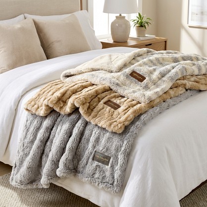 Indulge in pure comfort with these incredibly plush faux fur blankets that bring immediate coziness and elegance, complete with your logo or design on a leather patch.