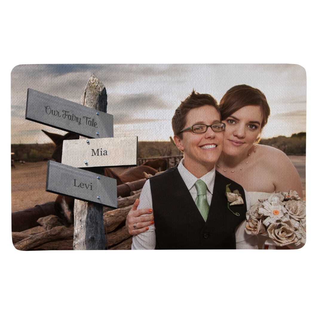At the crossroads of love and destiny, you found each other. This sweetly personalized mat perfectly captures that moment.