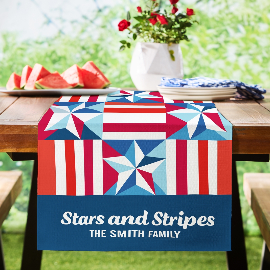 Set the table in red, white and blue with a personalized table runner designed for gathering and celebration. Featuring a bold patriotic design and custom name personalization, it adds a festive finishing touch to everyday meals and special occasions alike.