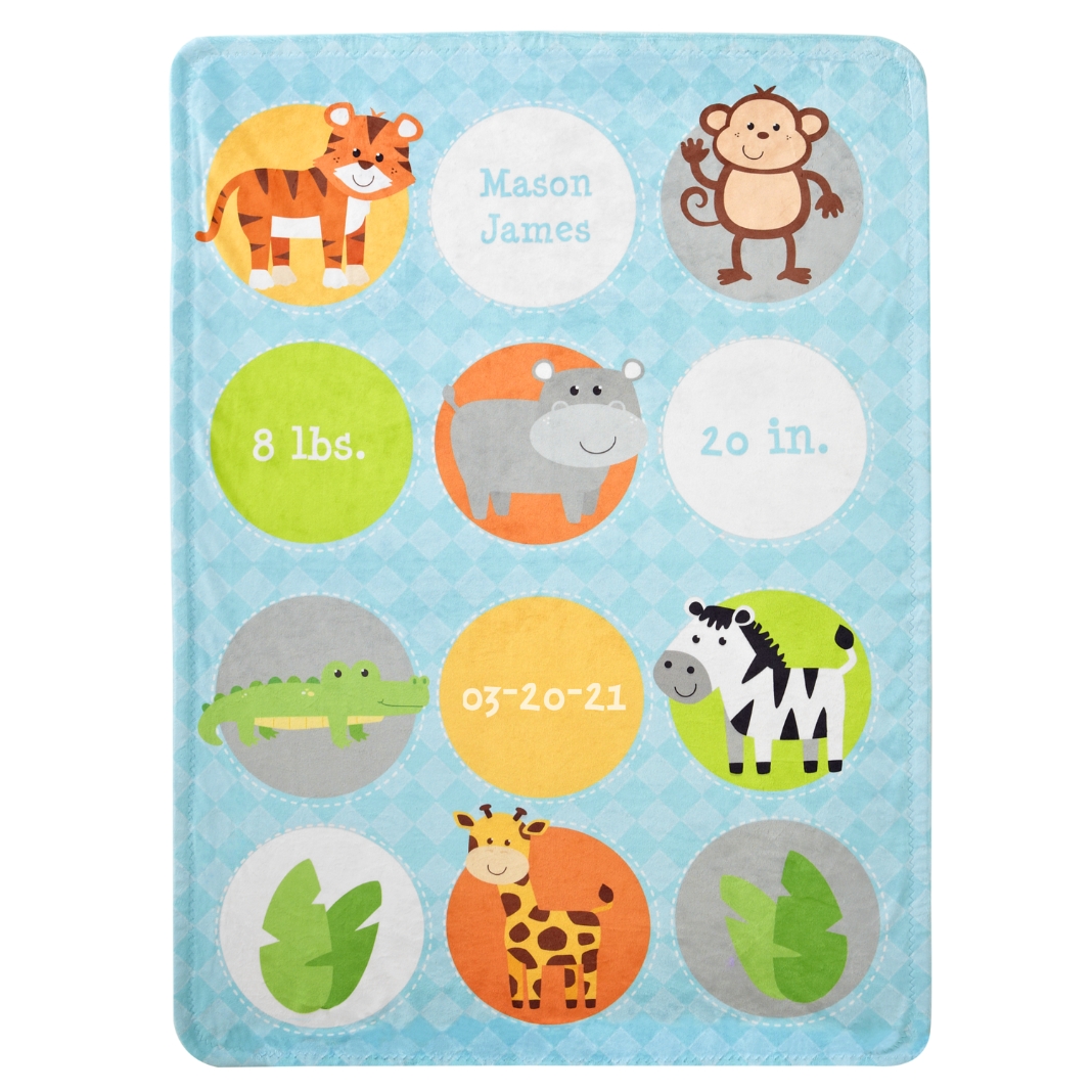 Wrap the newborn in our keepsake blanket featuring adorable animals and baby's birth stats.