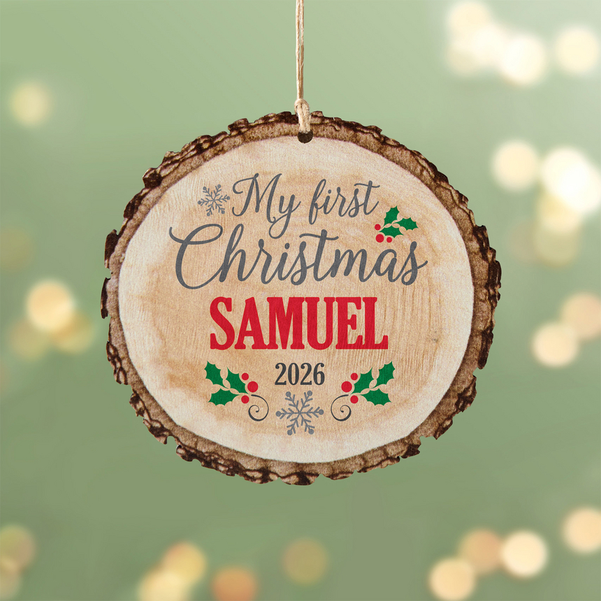 A sweet little slice of the woods comes home and hangs on the tree to make baby’s first Christmas a holly jolly time.