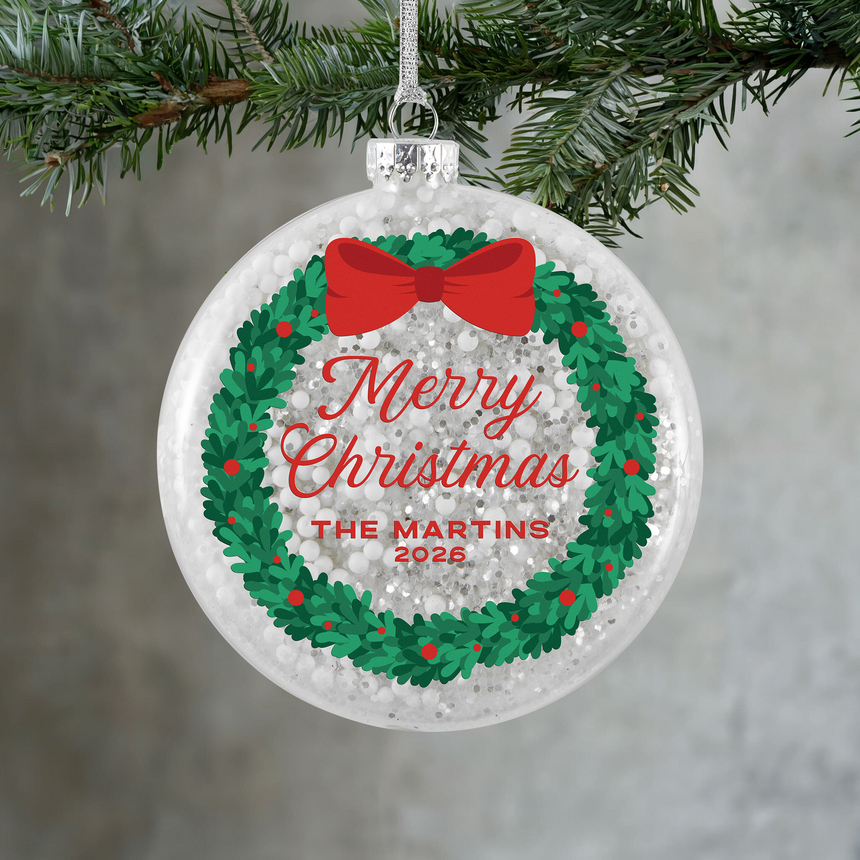 Add some shimmer to your season with this glittering glass wreath ornament. Personalize it with a name or message for a keepsake that sparkles with sentiment.