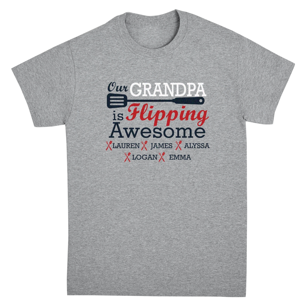 - Personalize with any title (Dad, Grandpa, etc) up to 10 characters and 1 to 12 names up to 10 characters each (“is Flipping Awesome” will always appear)