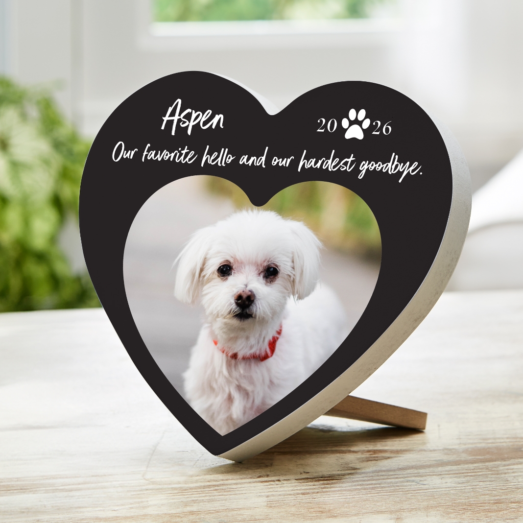Never forget a beloved pet with a personalized wood heart featuring their photo. This charming memorial will honor their life and your never-ending bond.