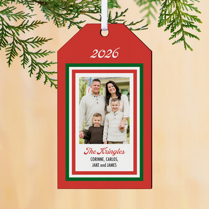 Why settle for a plain tag when your gift can come with a keepsake? This tag ornament frames your favorite photo with a jolly holiday border, turning every present into something truly personal and tree-worthy.