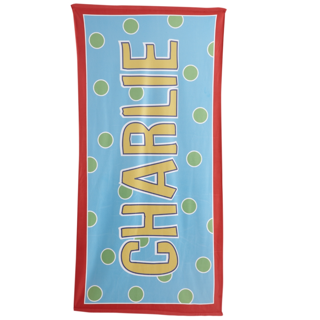 A Personal Creations Exclusive! Our big, bold towels are easy for kids to spot at the beach! Choose pastel or primary colors. We personalize towel with any name, up to 12 characters. Made of ultra-soft 100% polyester. Measures 30" L x 60" W. Machine washable.