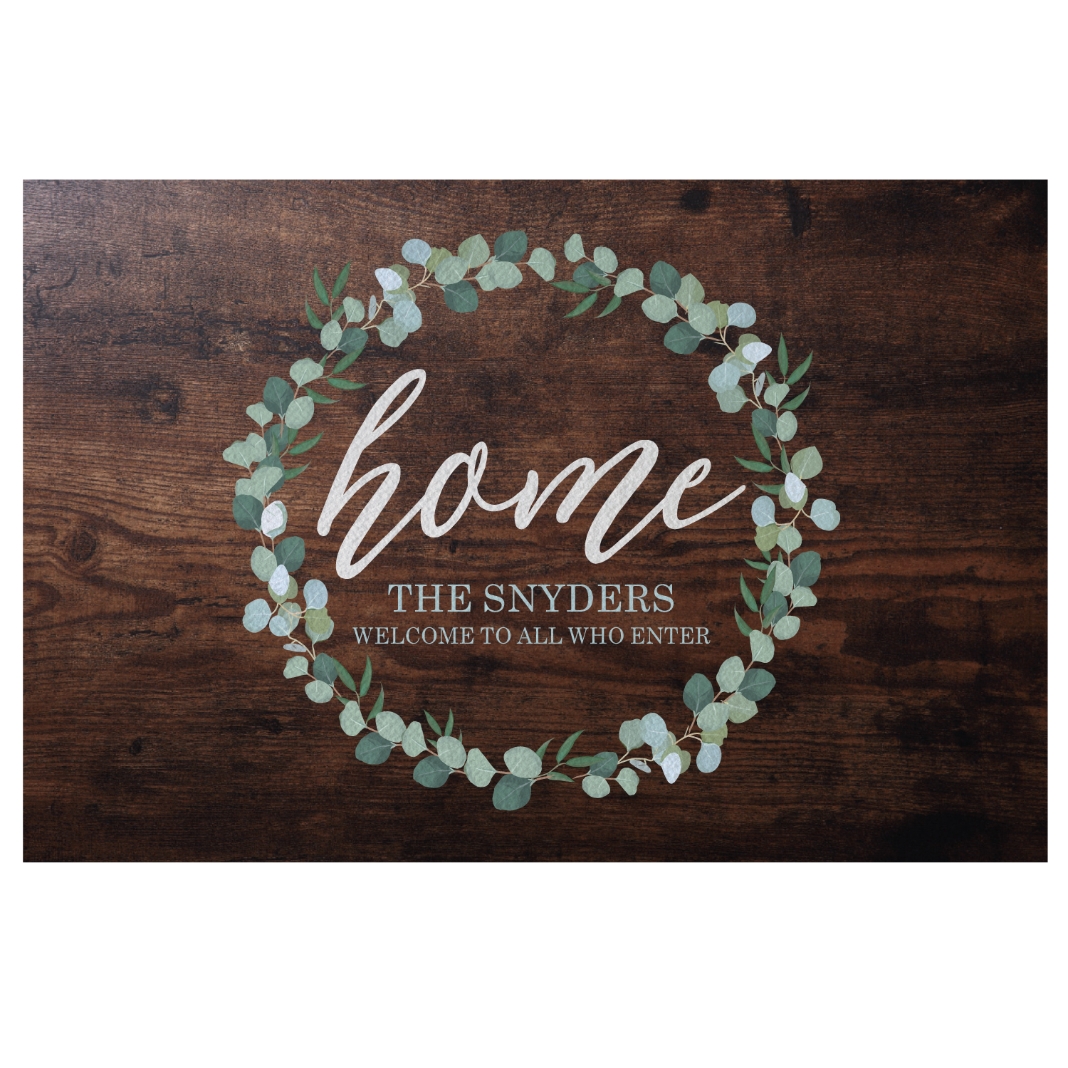 A stylish wreath arrangement and an elegant rustic background bring a charming, warm welcome to any entryway.