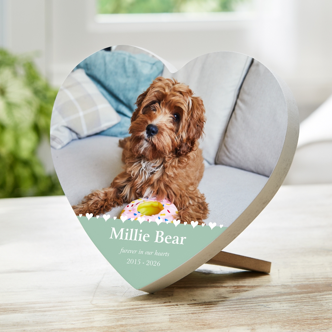 Salute a beloved pet with a personalized wood heart. This picture-perfect memorial will honor the important role they played in your life and help lift your spirits in their absence.