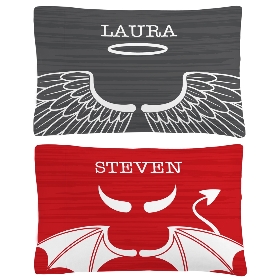 Devil or angel? You decide which of you wears the halo or horns with these playful pillowcases, sure to spice up slumber time.