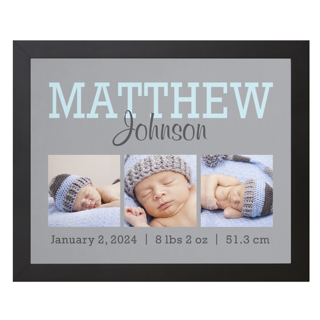 - Lovingly personalize with any name up to 12 characters, any middle/last name up to 20 characters, three photos and any date, weight and length