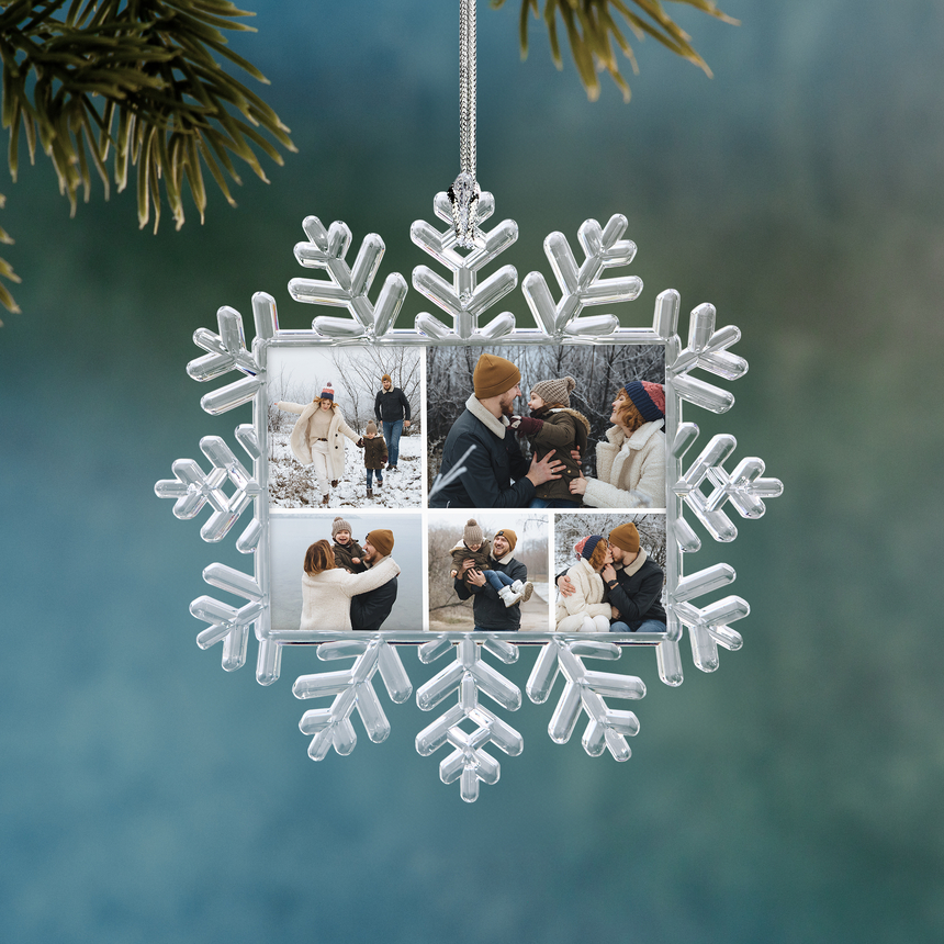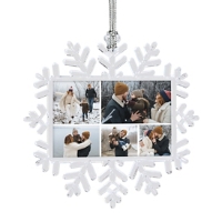 So many memories, one stunning ornament. This snowflake-shaped keepsake shows off your favorite snapshots, front and back. It’s like a photo album in glittering disguise.
