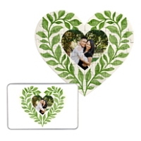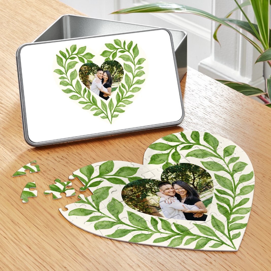 This puzzle is a fun and thoughtful way to piece together your favorite memory. Shaped like a heart and accented with delicate greenery, it features your photo at the center, making it an ideal gift or keepsake.