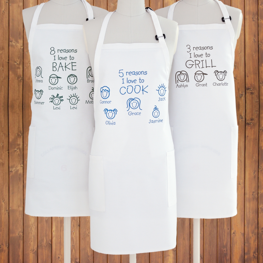 A Personal Creations Exclusive! Cooking is made a little sweeter by showing the ones you love to cook for. We personalize apron with any 2 digit number, any title (cook, bake, etc.) up to 9 characters, up to 12 icons (choose from Dad (spike, casual, business or part), Mom (long flip, curly, straight long or bob), Boy(spike, casual, baseball cap or part), Girl (long flip, pig tails, curly or straight), Baby Boy, Baby Girl, Cat or Dog) with any name 9 chars. each. Choose from blue, green, burgundy or brown design. Apron measures 30"L is made of a 100% cotton twill and has 2 handy front pockets to hold cooking utensils. Features a 1”W adjustable strap. One size fits most. Machine washable.