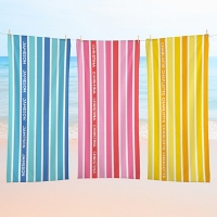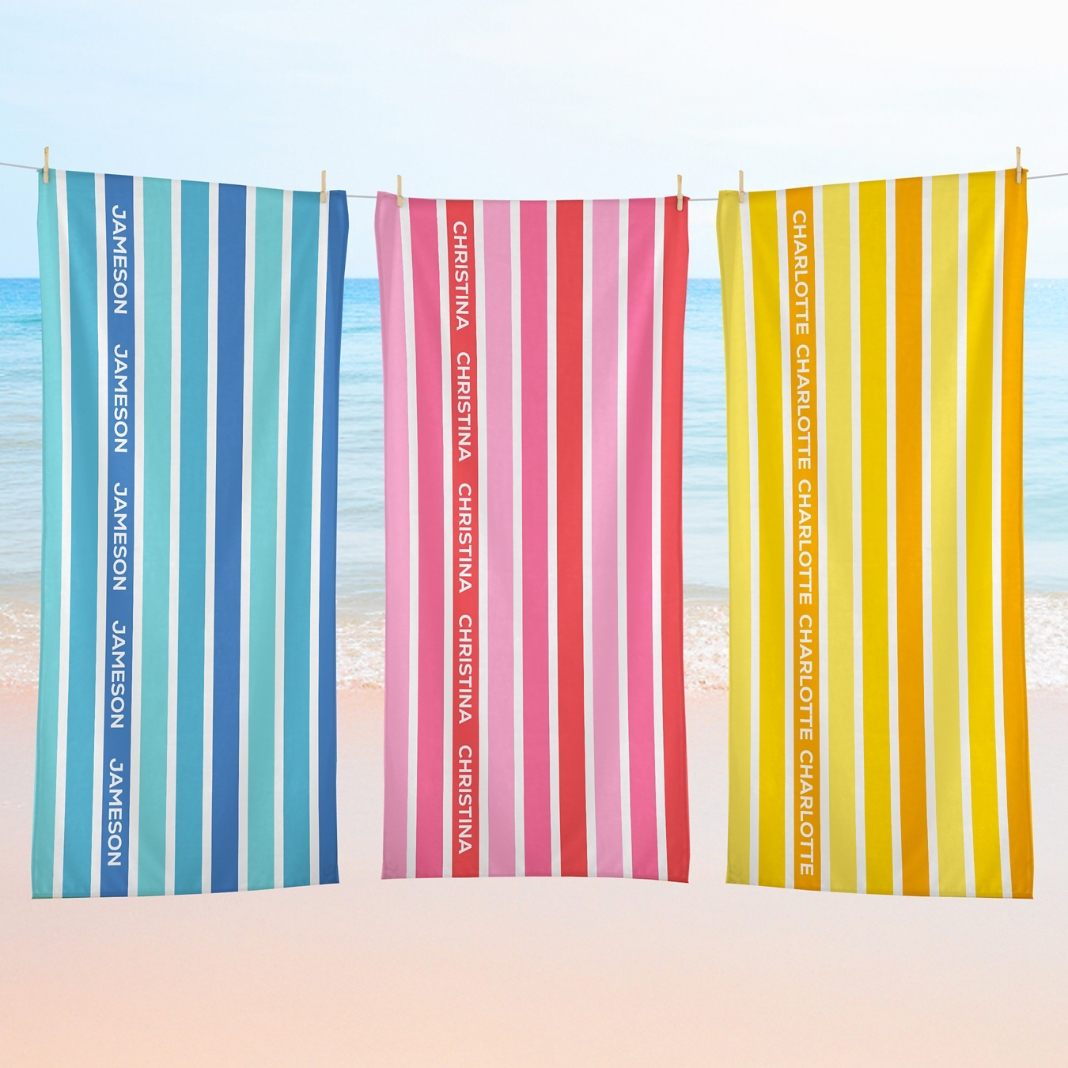 Stand out at the beach with this personalized towel. Featuring your name repeated across bold stripes, it adds a unique and colorful touch to every sunny day.