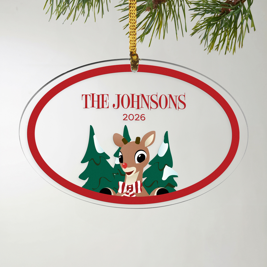 Our oval-shaped holiday ornament captures everyone's favorite red-nosed reindeer in his best light. Add the hero of Christmas to your tree this year!