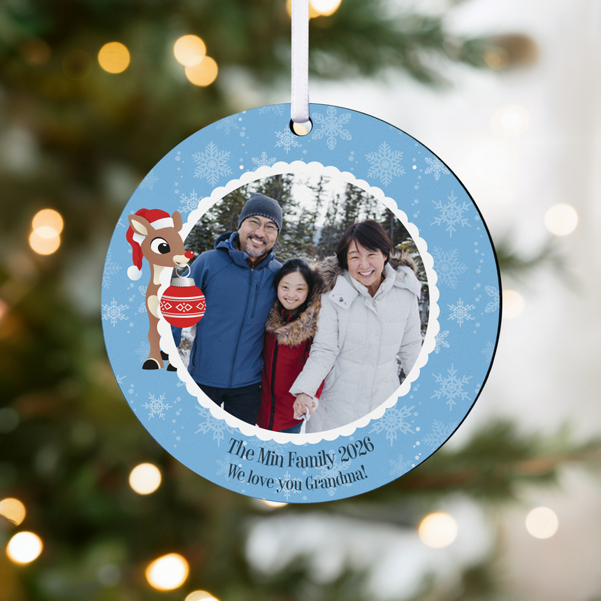 You and your family can forever hang out with Rudolph® on this precious snowflake ornament.