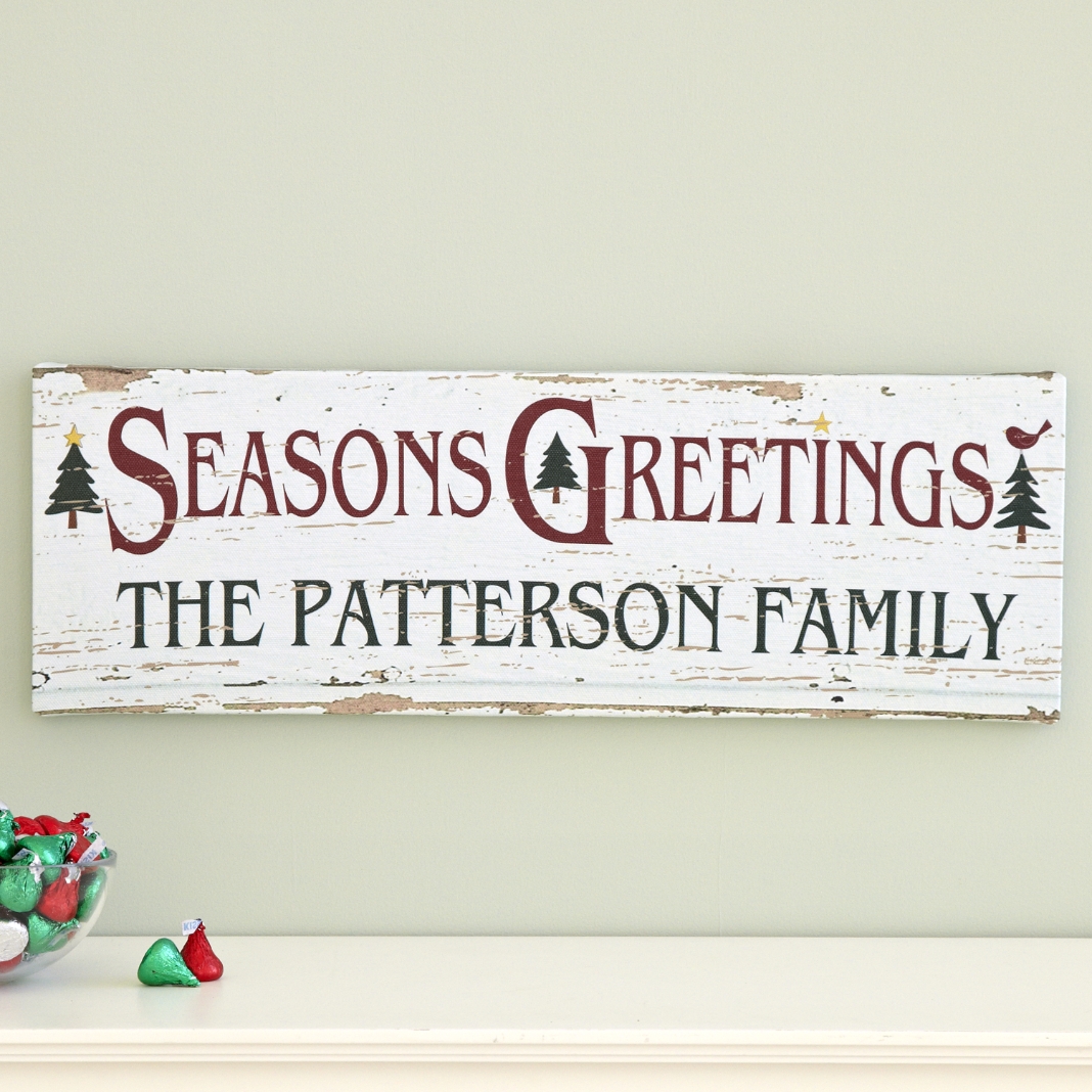 A Personal Creations Exclusive! Spread seasons greetings with a festive Christmas art canvas. We personalize with any message on 1 line, up to 24 characters. "Seasons Greetings' will always appear. Choose form 5"H x 11"W or 6"H x 18"W. Canvas is stretched over a solid wood frame. Item cannot be gift boxed.