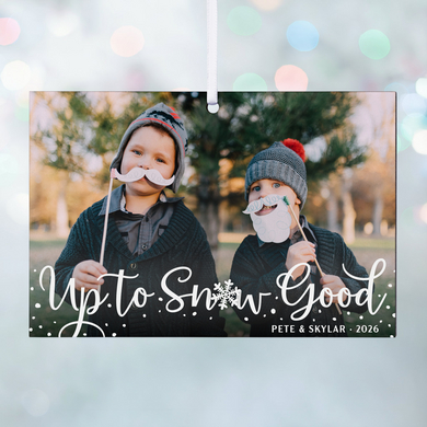 Snow much fun in one ornament! The personalized "up to snow good" ornament brings festive cheer and a touch of mischief to your tree this season.