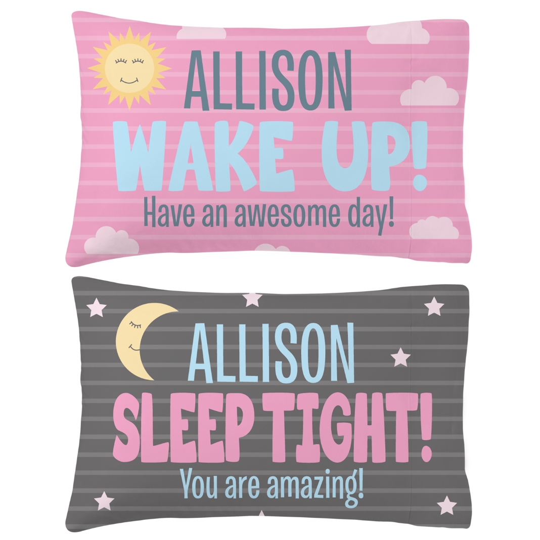 Give them some good night wishes, and also an extra nudge in the morning with this charming pair of pillowcases.