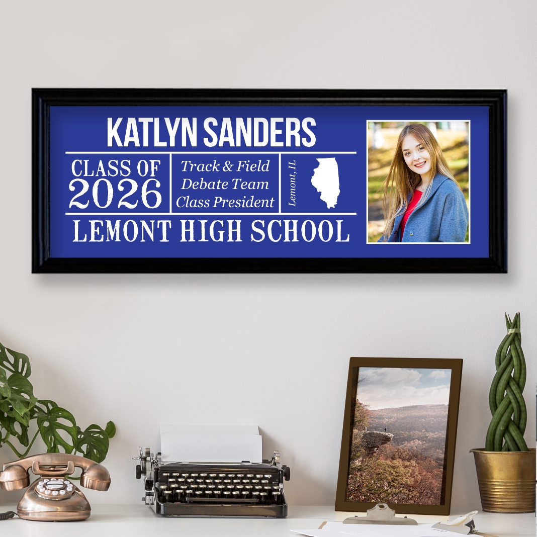 - Personalize with any photo, name up to 16 characters, year (“Class Of” will always appear), location (city/state) up to 18 characters