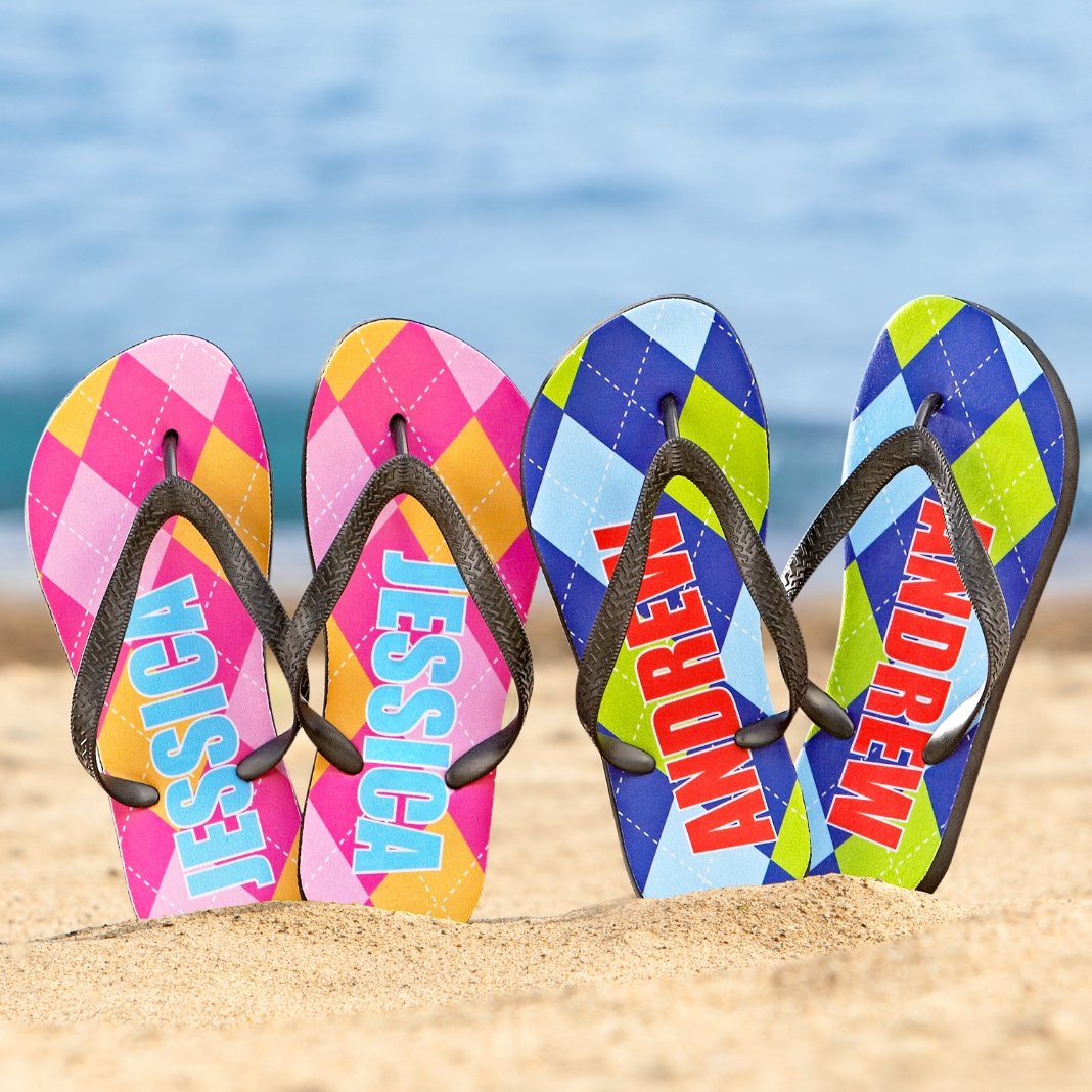 A Personal Creations Exclusive! Sensational flip-flops feature a classic argyle pattern in bright and lively colors.