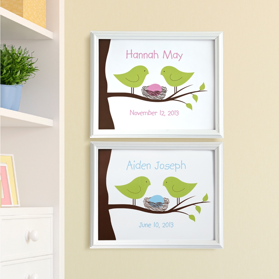 A Personal Creations Exclusive! Mommy and Daddy lovebirds are perched on a tree branch anticipating, with great love and excitement, the birth of their precious baby bird. We personalize our sweet print with baby’s name, up to 12 characters, and birthdate. Print comes protected under glass in our 11"L x 14"W white wood frame.