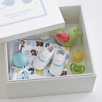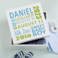 A Personal Creations Exclusive! Keep mementos from baby’s miraculous first months or baptism day in this pretty white wood box. A thoughtful gift for new parents, it has a removable lid that features a stork carrying a little bundle of joy and the heart-warming phrase “Baby, a Special Gift Sent from God.” We personalize it with any name, up to 25 characters, and any date. Choose from pink or blue. Measures 12”L x 12”W x 6"H.