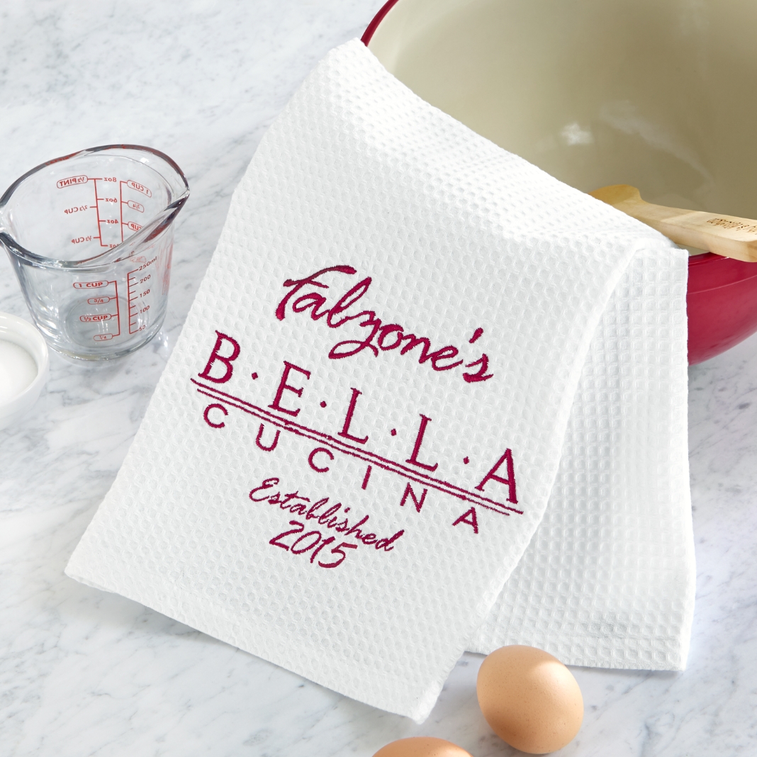 A Personal Creations Exclusive! A tasteful tribute to her love of cooking and entertaining, our elegant waffle weave towel will be a lovely complement to her Italian-themed kitchen or dining room.