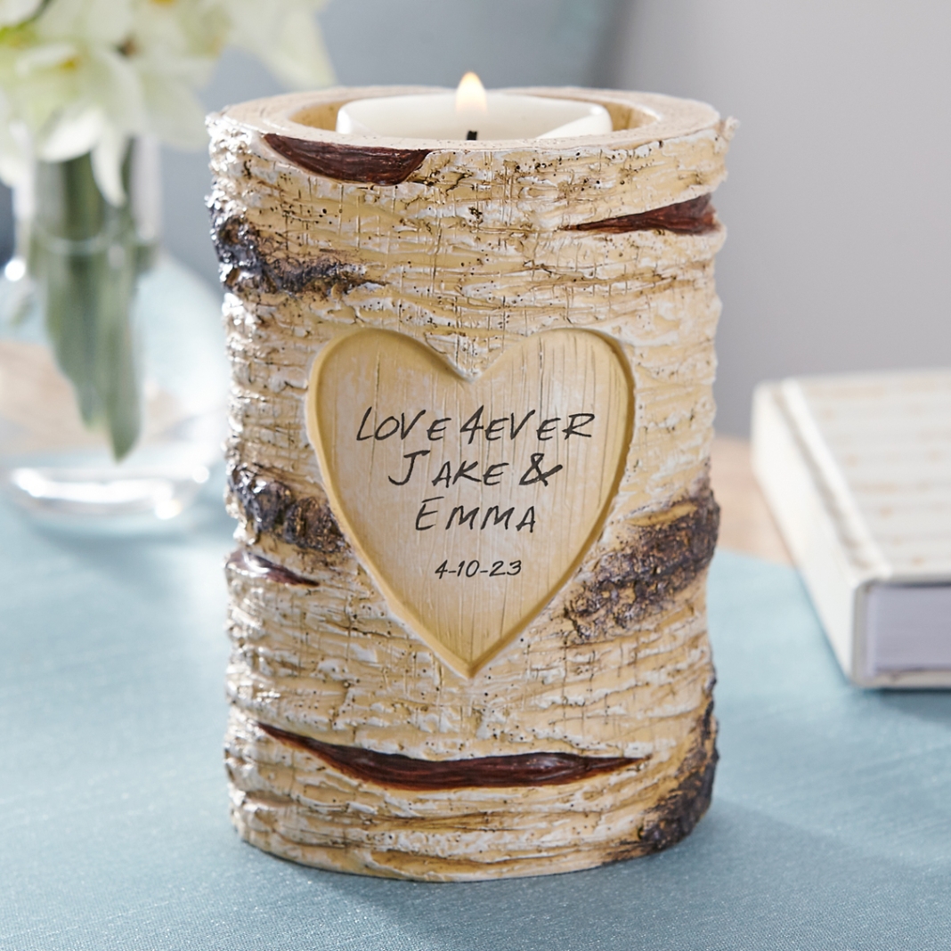 Tree-carved expressions of love speak to its enduring and timeless nature. This candle holder will shine brightly for a special couple you know.
