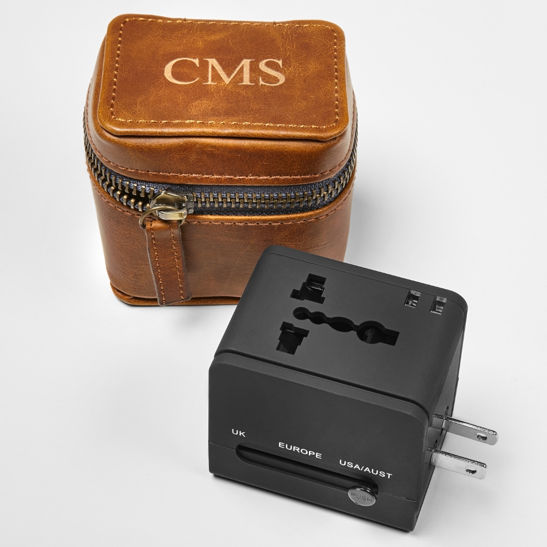 The perfect accessory for the connected world traveler! Housed in a soft, vegan leather carrying case with a weathered finish, this international adapter keeps you fully charged. Works for the UK, Australia, Europe and U.S.