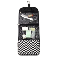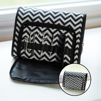 Travel just got a whole lot simpler with our Chevron Hanging Cosmetic Bag. This on-the-go essential includes a grooming set and several pouches for maximum organization and travel management. Available in black with your choice of thread color.