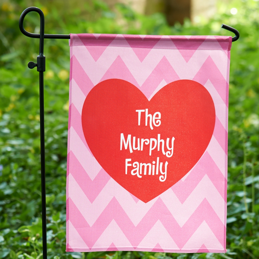 A Personal Creations Exclusive! Extend bold and bright Valentine’s Day greetings to friends and neighbors with our attention-grabbing garden flag. We personalize it with any message on 3 lines, up to 12 characters per line. All-weather, single-sided garden flag (14-3/4"L x 11-1/4"W) is made of durable nylon. Black wrought iron garden stake (39") is sold separately. Stake cannot be gift boxed.