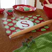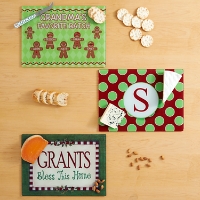 A Personal Creations Exclusive! Counter-saving tempered glass cutting board is shatter-resistant and features protective pads on bottom. Choose from Bless This Home, Polka Dot or Gingerbread design. We personalize Bless This Home design with any name, up to 12 characters; Polka Dot with any single initial; and Gingerbread with any title (Grandma, Mom, etc.) up to 12 characters, and up to 12 gingerbread kids and pets with any name, up to 9 characters. Choose from Boy, Girl, Baby Boy, Baby Girl, Cat or Dog. “Favorite Batch” will always appear. Measures 15-1/4"L x 11-1/4"W. Dishwasher safe. Item cannot be gift boxed.