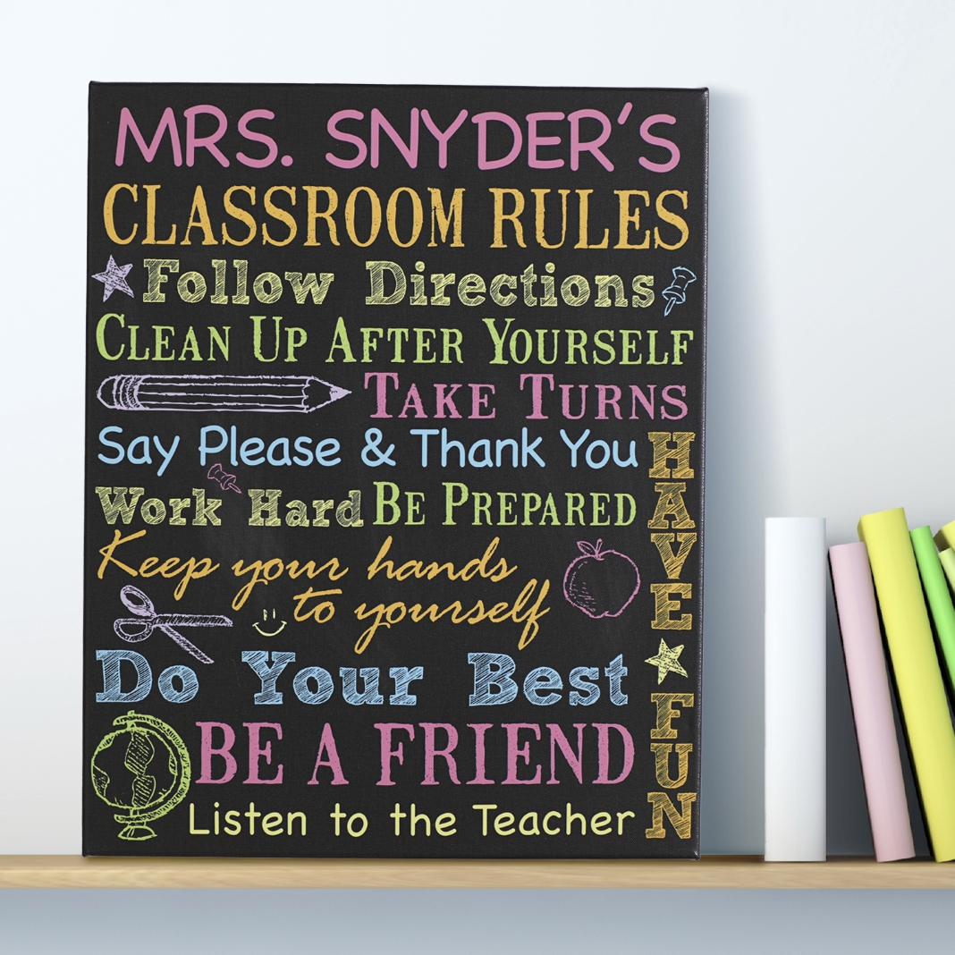 Your top teacher will surely appreciate this playful roster of top-ten classroom rules. Blackboard-look motif on high quality art canvas features cheerful, chalky colors surrounding his/her name. Solid wood frame with sawtooth hanger.
