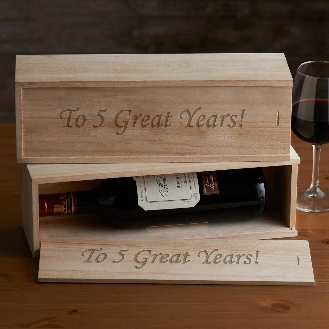 What a great way to celebrate a company or employee milestone! Or to thanks that special client. Here is a refined gift to accompany a special bottle of wine. This box is made of wood with metal accents, complete with a hinged lid and decorative latch. The box is adorned with a brass plaque, on which we engrave any monogram or 2 line message up to 25 characters per line. Holds a standard 750 ml bottle of wine. Measures 12 3/4" H x 4" W x 4" D.