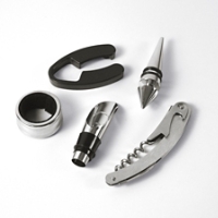 - Includes wine opener, foil cutter, wine stopper, drop-stop collar and wine spout in a plastic case