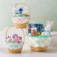 Add a festive touch to Easter with these cheerful baskets. Made of classic wood wicker, their bright plaid personalized liners brings playful charm to egg hunts and springtime treats.