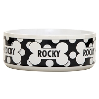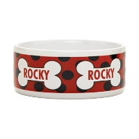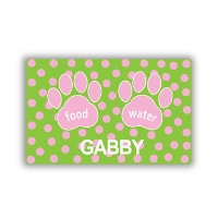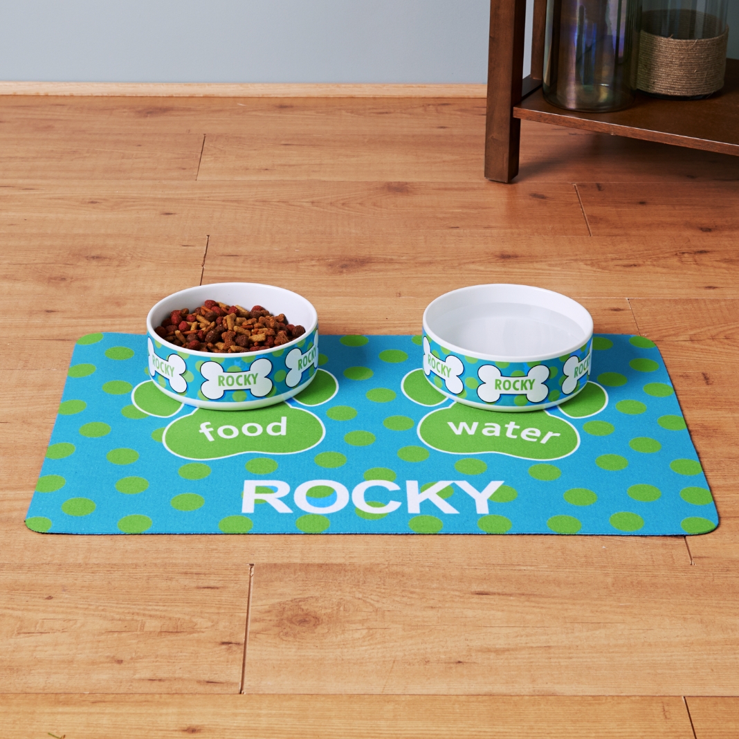 A Personal Creations Exclusive! Darling dog bones and perky polka dots accent our cheerful feeding time accessories. Heavy-duty ceramic bowl is available in Small (5"L x 1-1/2"H) and Large (7"L x 3"H). Pet mat is available in Small (13"L x 19"W)and Large (17"L x 27"W). We add any name, up to 9 characters, on bowl and up to 20 characters on the mat. Choose from green with pink polka dots, blue with green polka dots, black with white polka dots or red with black polka dots. Mat has a polyester surface, nonslip backing, and cleans easily with a hose. Hand wash bowl.