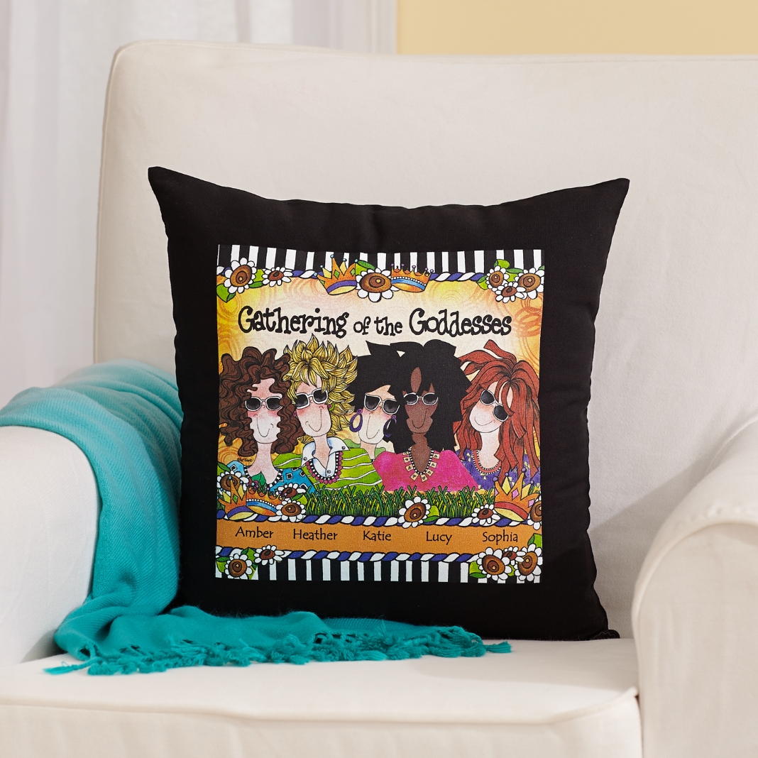 Sit back and relax with your favorite goddesses. This Suzy Toronto pillow captures the spirit of beautiful friendships.
