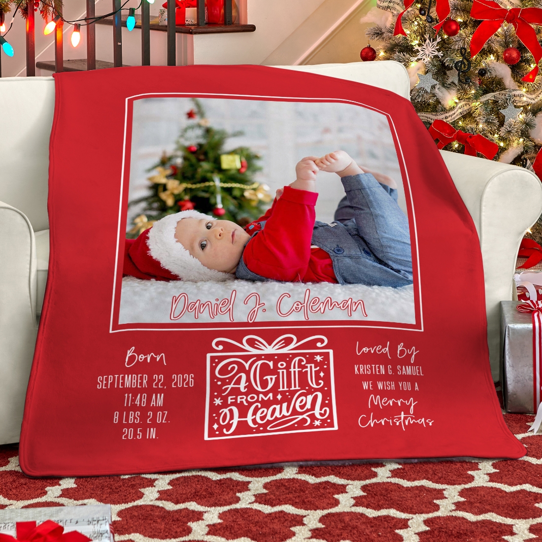 Celebrate a new arrival and the festive holiday season in one fell swoop! This charming blanket, featuring a photo and birth details, is sure to be a family keepsake.