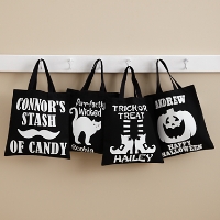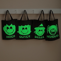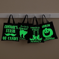 Fiendishly fun trick-or-treat bags feature exciting glow-in-the dark designs. Choose Mustache, Pumpkin, Witches Shoes, Cat, Frankenstein, Vampire, Witch, Spider, Skeleton or Owl. We personalize each one with any name, up to 10 characters. (When personalizing "Mustache" design, please note that the apostrophe S will always appear.) Our black cotton tote bag measures 14"L x 13"W. Machine washable.
