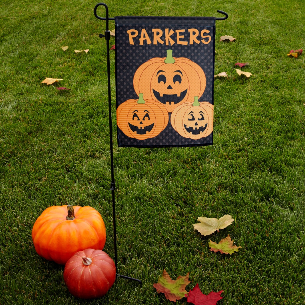 A Personal Creations Exclusive! Vibrant, all-weather, single-sided garden flag makes a bewitching accent for your Fall garden or lawn. Choose from Pumpkin, Owl or Spider design. We add any name, up to 12 characters. Flag measures 14-3/4"L x 11-1/4"W. Black metal stake measures 30-1/4"H. Stake cannot be gift boxed.