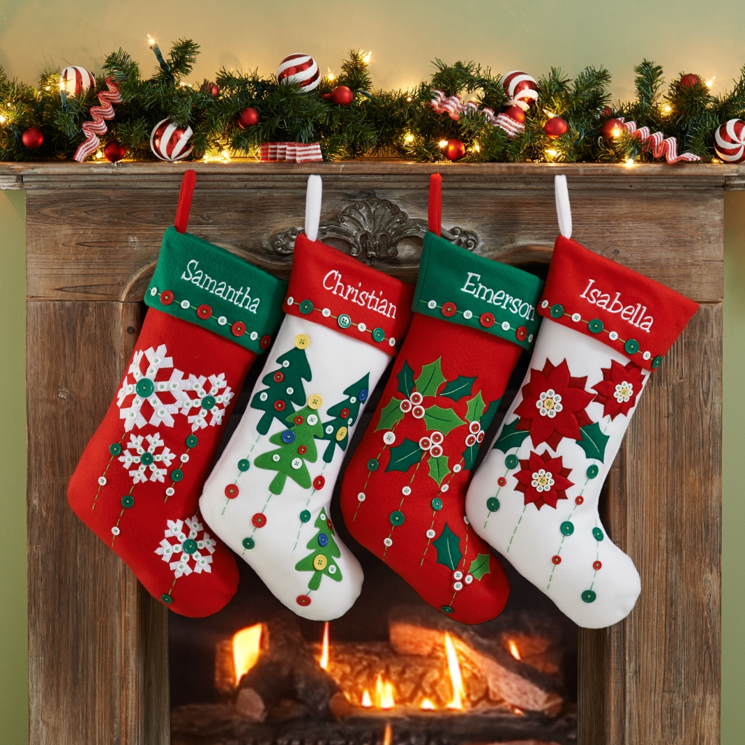 Colorful buttons give our cheerful fleece stocking a bit of retro holiday charm. Choose Tree, Poinsettia, Holly or Snowflake design. We embroider any name, up to 9 characters. Design is on the color of the item shown. Polyester. Measures 19-1/2"L. Spot clean. Exclusively from Personal Creations.