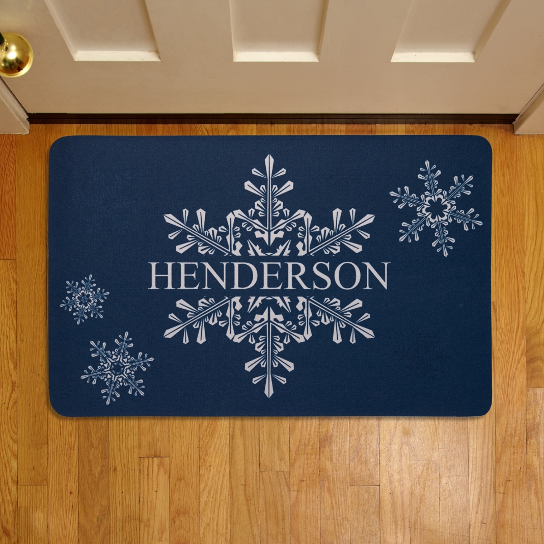 A Personal Creations Exclusive! Lift the mood of all who visit with an inviting winter doormat. Please specify Holly, Chevron, Snowflake or Bless This Home design. We add any name, up to 12 characters (Holly design - "Welcome to the" will always appear and Chevron design - "The" & "Family" will always appear). Our doormat features a polyester surface and nonslip rubber backing. Suitable for indoor or outdoor use. Measures 17Lx27”W. Cleans easily with soap and water. Item cannot be gift boxed.